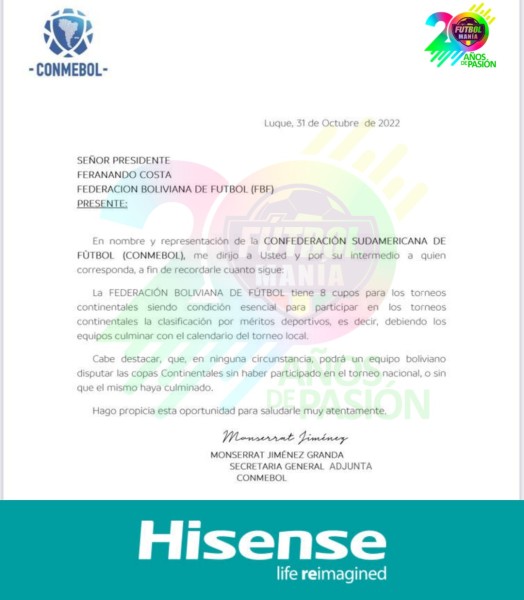 “En ninguna circunstancia, podrá un equipo boliviano disputar las copas Continentales sin haber participado en el torneo nacional o sin que él mismo haya concluido” advierte la CONMEBOL en la carta a la FBF.