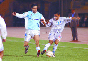 Percy Colque de Bolívar protege la pelota ante la marca de Bernardo Aguirre de Aurora. (Foto Jorge Abrego-ANF)El encuentro tuvo un marco digno de las grandes ocasiones, pero muy poco de sudamericano, por el bajo nivel técnico que acusaron ambos conjuntos, con figuras sin iniciativas para quebrar las férreas marcas de las defensas que abortaron las pocas situaciones de gol, registradas en la confrontación.