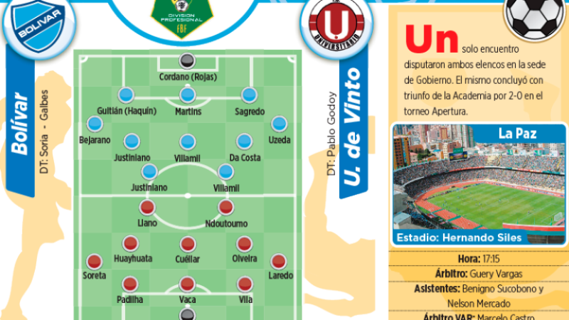 Club BolívarEl partido con la U de Vinto arrancará a las 17:15, en el estadio Siles