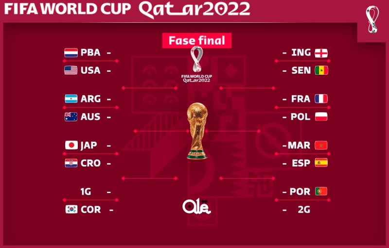 Hasta el momento ya se confirmaron seis choques en dicha instancia: Países Bajos (1° A) vs. Estados Unidos (2° B), Inglaterra (1° B) vs. Senegal (2° A), Argentina (1° C)-Australia (2° D), Francia (1° D)-Polonia (2° C), Marruecos (1° F)-España (2° E), Japón (1° E)-Croacia (2°F). Brasil, Portugal y Corea del Sur esperan rivales.