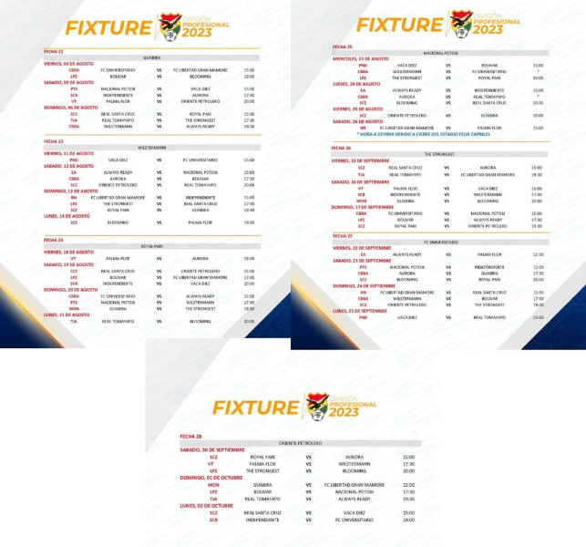 La Federación Boliviana de Fútbol (FBF) aprobó y anunció la programación de partidos de otras siete jornadas del torneo “todos contra todos”, esto contempla de la vigésima segunda a la vigésima octava. Entre medio habrá un paréntesis entre la vigésima quinta y la vigésima sexta.