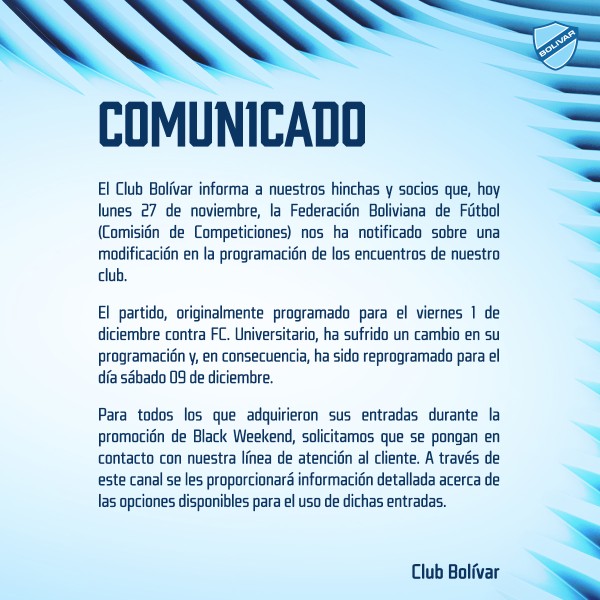 El Club Bolivar informa a nuestros hinchas y socios que, hoy lunes 27 de noviembre, la Federación Boliviana de Fútbol (Comisión de Competiciones) nos ha notificado sobre una modificación en la programación de los encuentros de nuestro club.