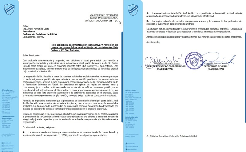 El club Bolivar mando una carta dirigida al presidente de la Federación Boliviana de Futbol, al Presidente Fernando Costa:
